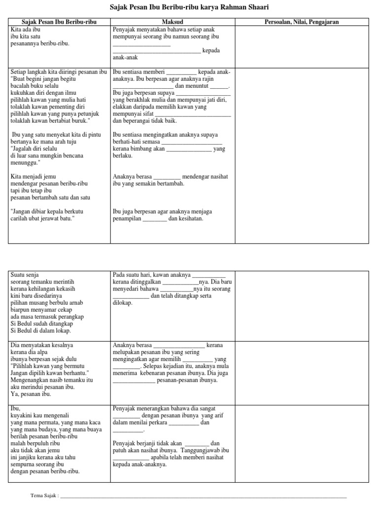 . Maksud rangkap rangkap 1 Setiap orang anak mempunyai seorang ibu sahaja tetapi pesanan ibu kepada anak. Report an issue. Apakah nilai yang terdapat dalam petikan sajak di atas.